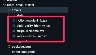 In the left sidebar, you’ll notice that React Email has 4 email examples you can preview. These correspond with the .tsx files inside the react-email-starter/emails directory: