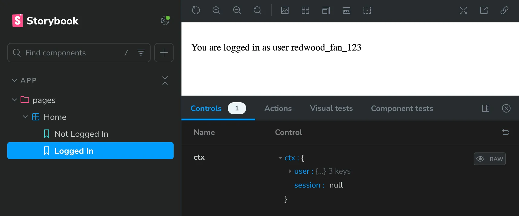 Let’s do it:src/app/pages/Home.stories.tsx 20 collapsed linesimport type { Meta, StoryObj } from "@storybook/react";import { Home } from "./Home";const meta: Meta<typeof Home> = {component: Home,};export default meta;type Story = StoryObj<typeof Home>;export const NotLoggedIn: Story = {args: {ctx: {user: null,session: null,},},};export const LoggedIn: Story = {args: {ctx: {user: {id: "1",username: "redwood_fan_123",createdAt: new Date(),},session: null,},},argTypes: {ctx: {options: ["redwood_fan_123", "storybook_user", "example_user"],mapping: {redwood_fan_123: {user: { id: "1", username: "redwood_fan_123", createdAt: new Date() },session: null,},storybook_user: {user: { id: "2", username: "storybook_user", createdAt: new Date() },session: null,},example_user: {user: { id: "3", username: "example_user", createdAt: new Date() },session: null,},},},},}; -